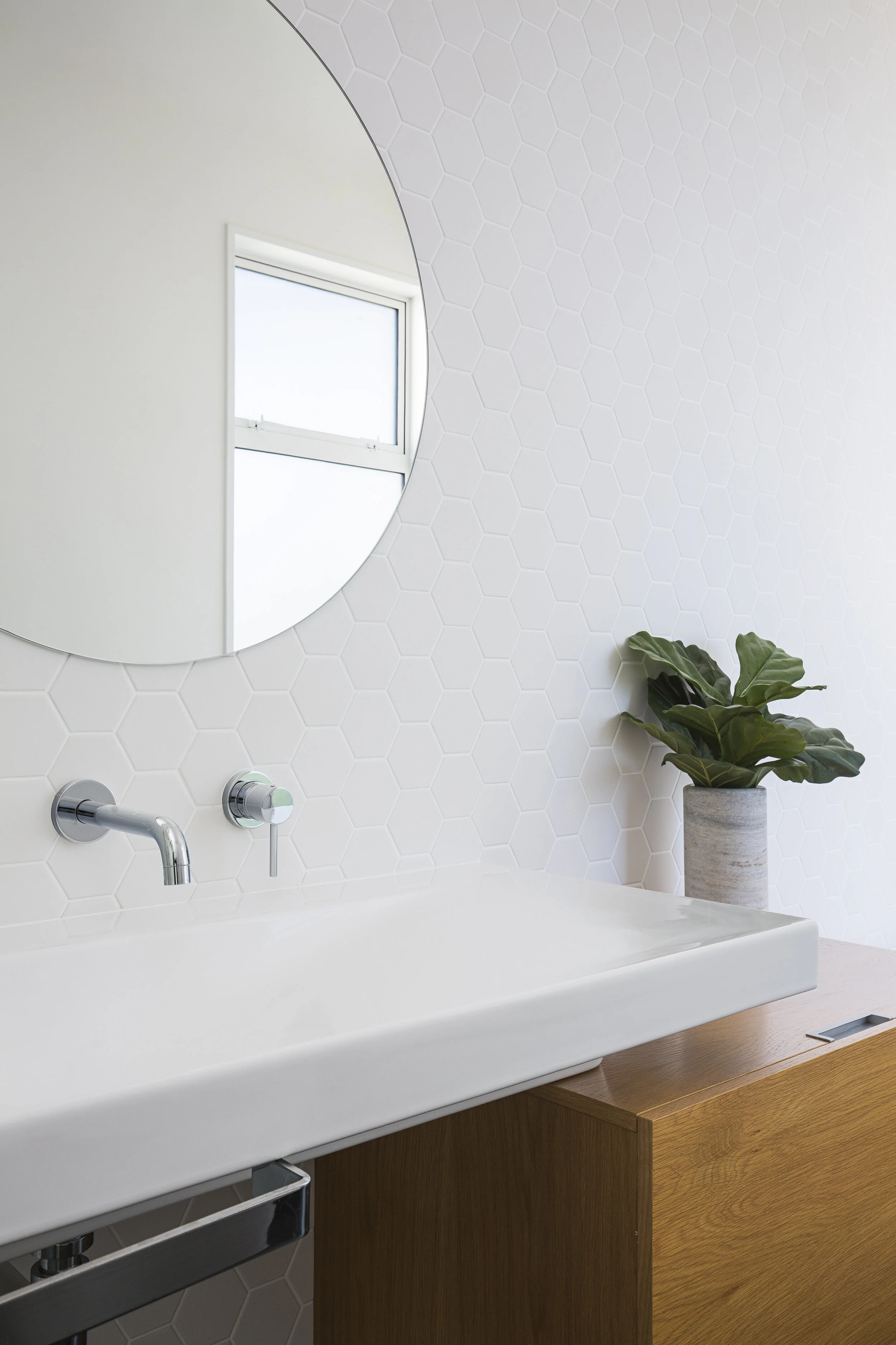 With this bathroom we went with classic whites on the walls, black matt tiles on the floor and chrome tapware. We selected hexagonal tiles to give texture to the walls, and this is teamed up perfectly with a round mirror and wall mounted basin spout and mixer. The acrylic stone bath sits well in front of the window with a floor mounted spout.