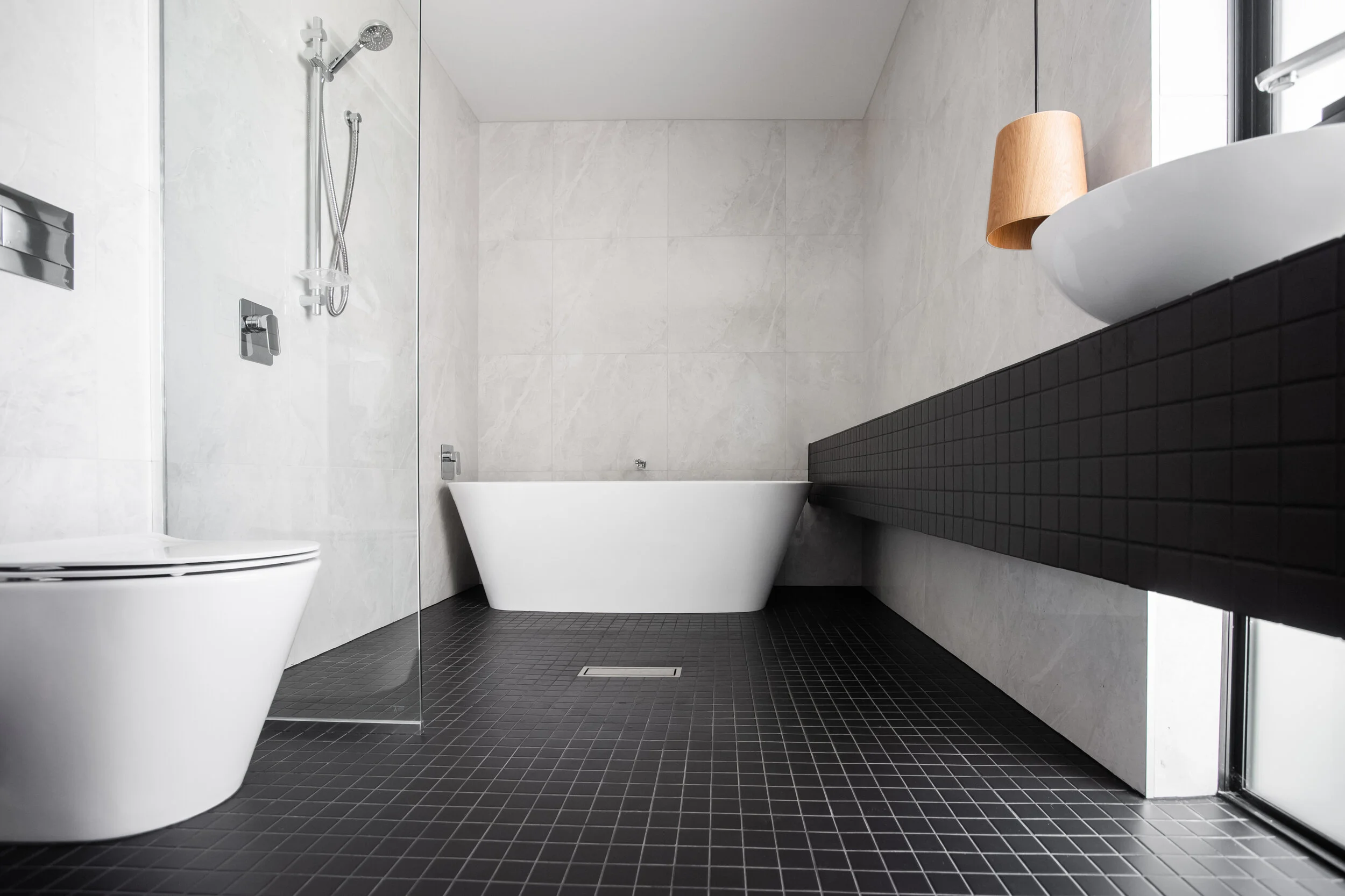 For this new family home in Prestons, we supplied floor plans, elevations and fixture selections. The Client then passed these documents onto their Building Contractor who managed the project. The brief was to create a uniquely architectural bathroom on a strict budget. For this we designed a floating bench which ran in front of a large window, we teamed this up with bench mounted basins and tapware. There is a freestanding bath within a wetroom with a shower, this works great when the kids are splashing in the bath!